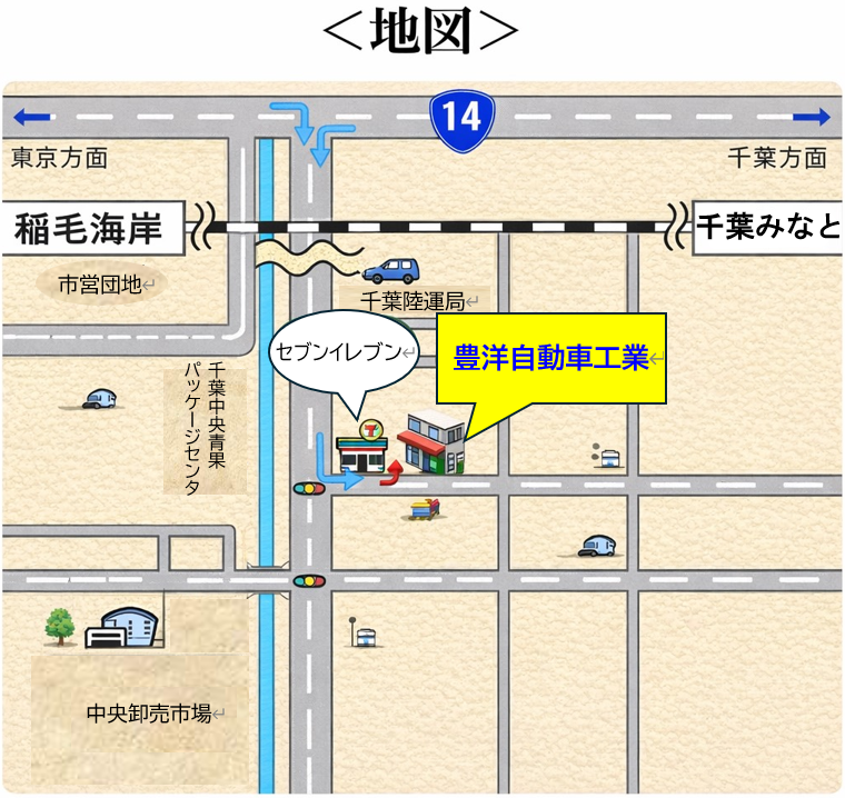 周辺地図 株式会社豊洋自動車工業 本社 〒261-0002 千葉県千葉市美浜区新港219-8 アクセス 電車の場合 JR総武線稲毛駅からバス(アクアリンク線)稲毛海岸駅行に乗車し、新港4番バス停で下車。そこから徒歩4分 自動車の場合 14号を海の方面に曲がり、セブンイレブンが見えたら左折。その隣が豊洋自動車工業です。※中にお入りいただき、弊社スタッフにお声がけください。