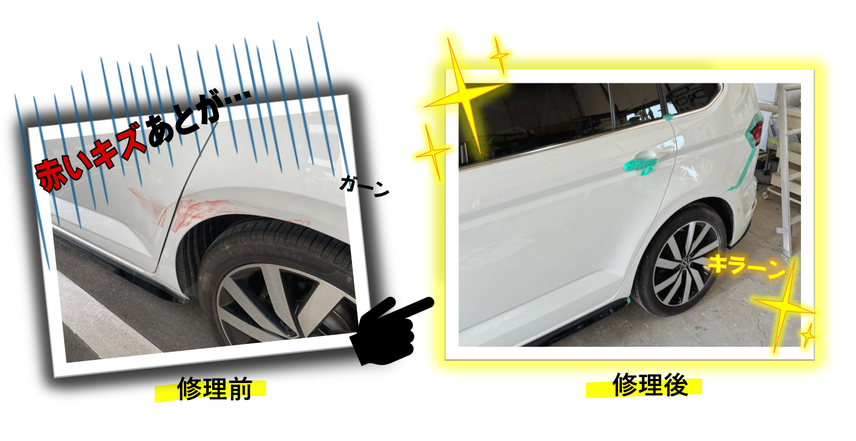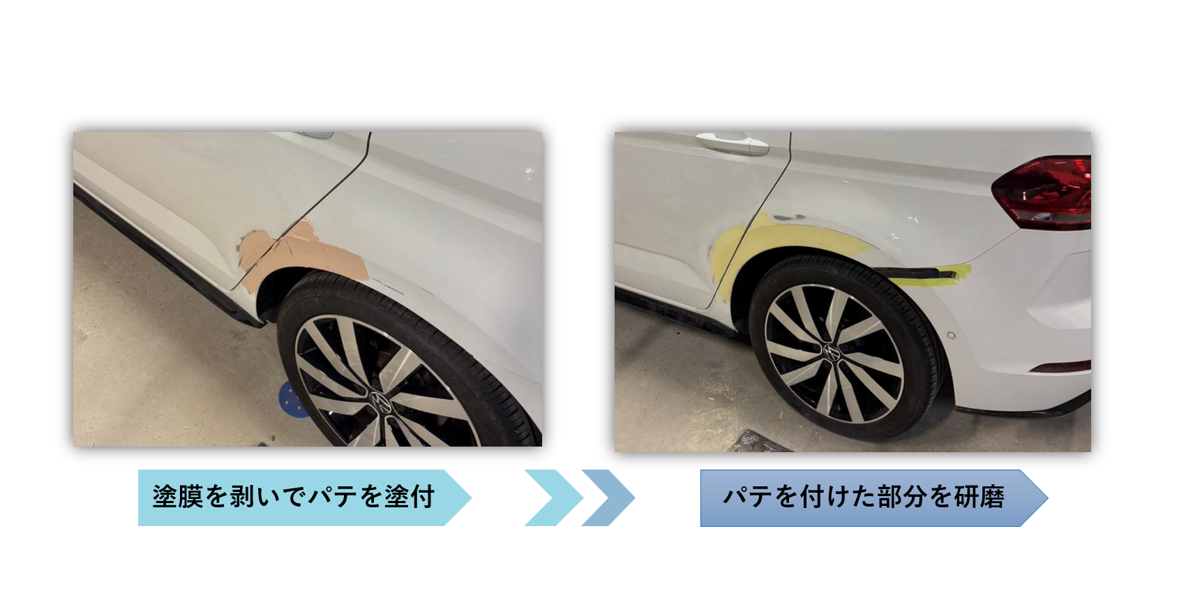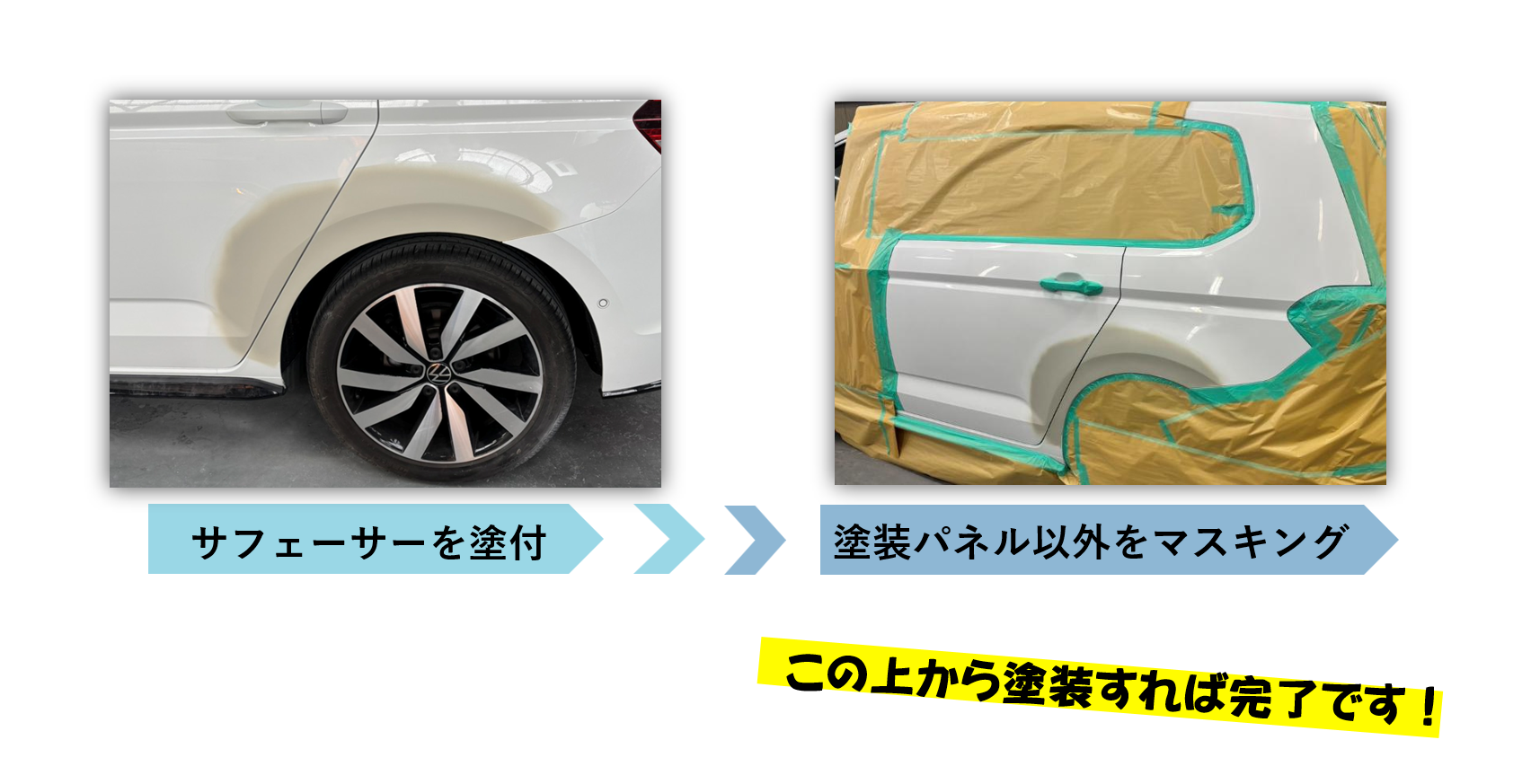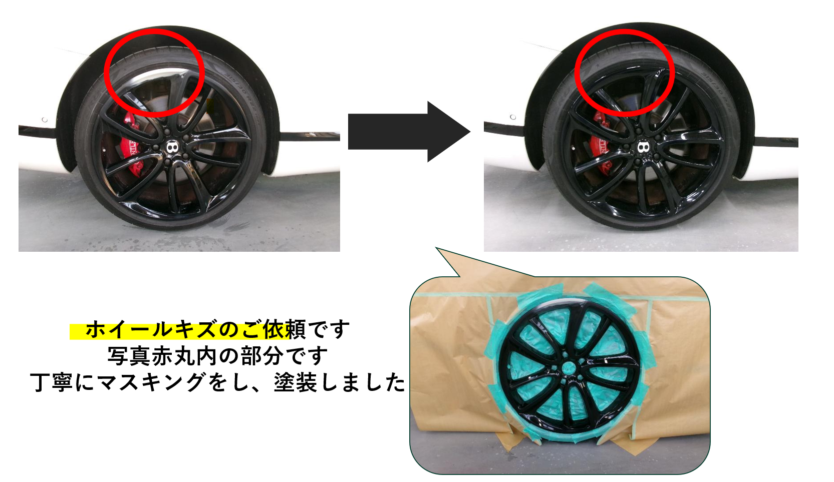 豊洋自動車工業の鈑金は綺麗に安く早くをモットーに頑張っております。キズついてお困りのお客様ぜひご相談ください!また、大型車も入れるピットもあります。小さな作業から大きな作業までプロの目で行います。 ご依頼例をいくつかご紹介します! 例)ホイールをこすってしまったお客様です。塗装するホイール表面以外を丁寧にマスキングし、塗装して完了です。 例)赤いキズあとがついてしまったお客様です。塗膜を研いで跡を消しパテを塗り、パテで埋めた表面の凹凸を削り表面を滑らかにします。そこにサフェーサーを吹き、乾燥したら塗装して完了です。